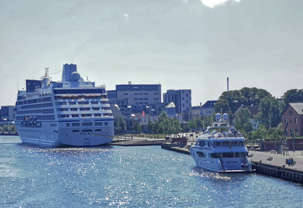 Die Dänen, eine große Seefahrernation. An einem späten Nachmittag rotierte mitten auf dem Fjord in Sichtweite der Promenade ein kleines Ruderboot um die eigene Achse. Drei laut grölende und diskutierende Dänen mit Bierdose schafften es offensichtlich nicht, dem Boot eine konkrete Richtung zu geben. Sie hatten die dänische Nationalflagge gehisst und als einer der Seeleute erschreckenderweise seine Hose auszog, war auch die Unterhose in Nationalfarbe. Historisch gesichert gibt es seit den Wikingern eine lange Tradition, mutig unbekannte Meere zu befahren und fremde Welten zu erobern. Die Drei waren auf dem besten Weg. Wir waren sehr froh über die rote Unterhose. Zwei weitere etwas größere und technisch besser ausgestattete Schiffe lagen am Pier. Das Kreuzfahrschiff Sirena trafen wir ein paar Tage später in Oslo wieder und die Reef Chief, eine 25 Millionen Dollar Yacht des US Amerikaners James Dicke (Vermögen 500 Millionen Dollar). Neugierig sind wir in der Regel nicht, aber die schwarz getönten Scheiben der Yacht, in die alle Touristen schauten, waren blickdicht und auf Deck ließen sich nur 3 hyperaktive Stewards blicken. Wir mussten uns also unsere Informationen aus dem Netz holen. Sehr angenehm für Kreuzfahrtsenioren, dass die Schiffe direkt hinter dem Schloss anlegen und die geführten Gruppen nur die Promenade überqueren müssen.