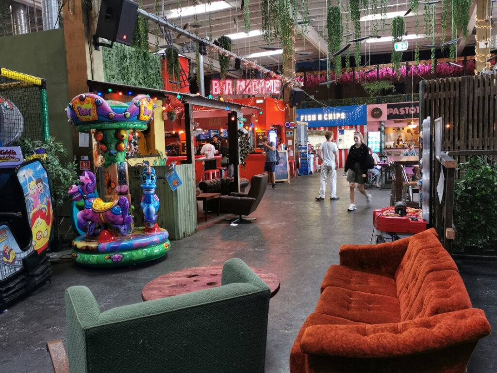 Aalborg strahlte eine unaufgeregte, sommerlich heitere Stimmung aus mit gratis Konzerten in der Innenstadt (Sommer-Lyd), Tanzen (komogdansdanmar) und Chillen an der Hafenpromenade und Open Air Kino in der Altstadt. Überall dabei auch bei Hitze das Streetfood und die dazu passenden, geschmackvoll eingerichteten Hallen, in denen sich alle treffen. Ich habe zu dieser grenzenlosen Vorliebe eine Verdacht und auch das passende Foto dazu. Die frühkindliche Prägung geht so. Der weite geöffnete Kinderwagen wird zentral mit Kind aufgestellt, damit die Grill- und Frittiergerüche ungehindert einziehen können. Niemand kann so ein frühkindliches Erlebnis vergessen und wird dann wahrscheinlich einen Großteil seines späteren Lebens in Streetfoodhallen verbringen. Vorurteil oder Spekulation? Könnte aber auch etwas dran sein. Wir haben uns natürlich dem Spirit der Halle gebeugt. Wer will schon auffallen.