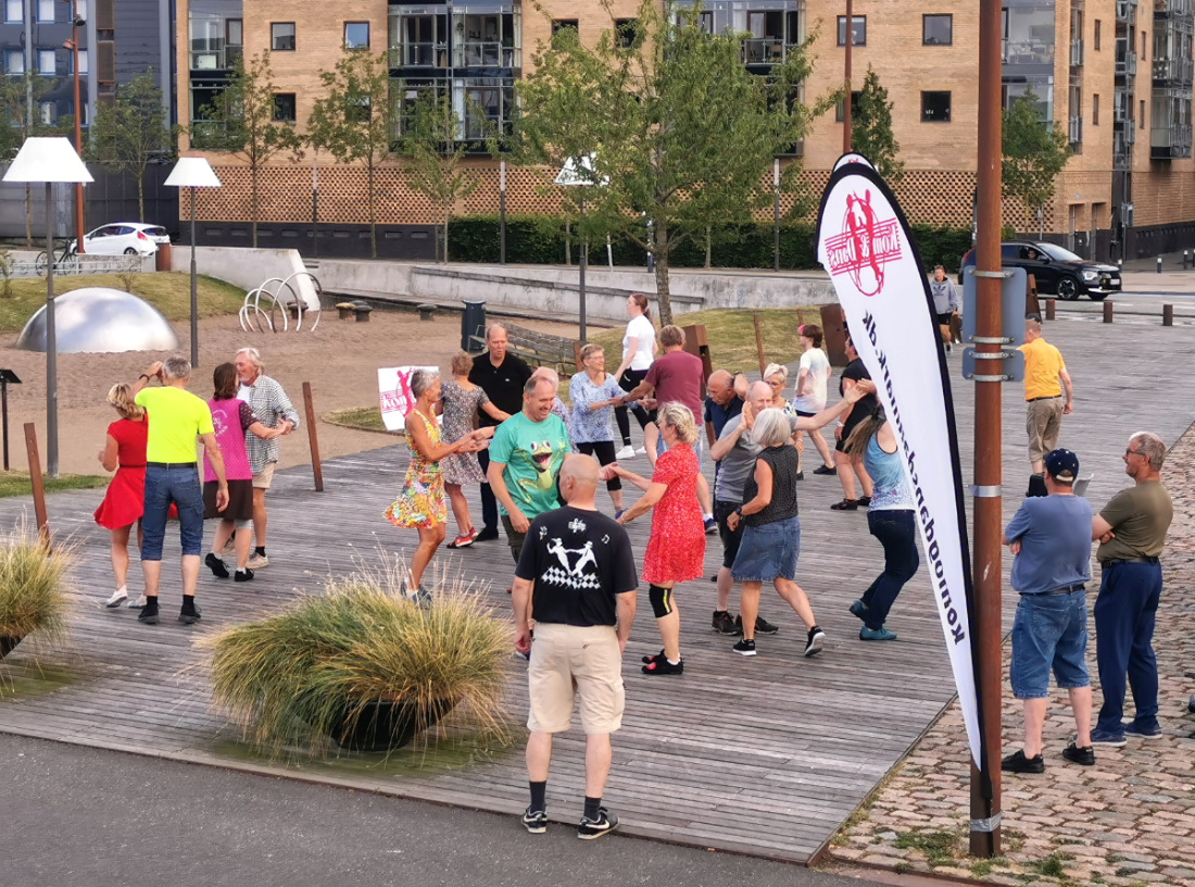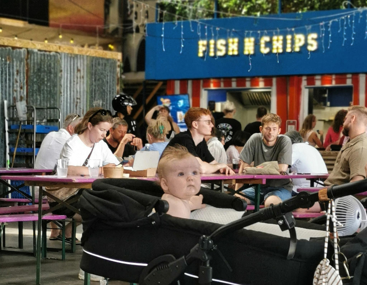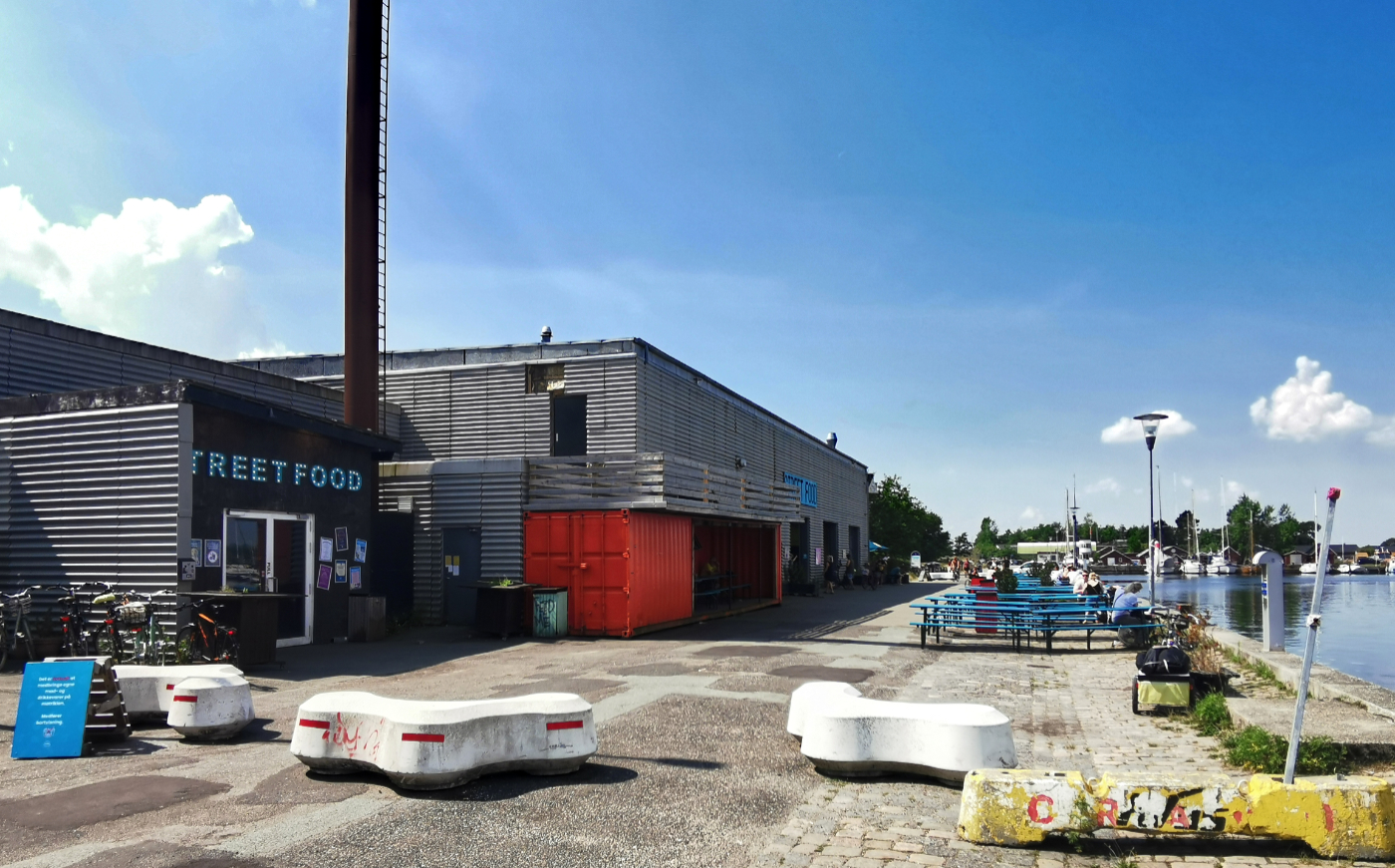 Aalborg strahlte eine unaufgeregte, sommerlich heitere Stimmung aus mit gratis Konzerten in der Innenstadt (Sommer-Lyd), Tanzen (komogdansdanmar) und Chillen an der Hafenpromenade und Open Air Kino in der Altstadt. Überall dabei auch bei Hitze das Streetfood und die dazu passenden, geschmackvoll eingerichteten Hallen, in denen sich alle treffen. Ich habe zu dieser grenzenlosen Vorliebe eine Verdacht und auch das passende Foto dazu. Die frühkindliche Prägung geht so. Der weite geöffnete Kinderwagen wird zentral mit Kind aufgestellt, damit die Grill- und Frittiergerüche ungehindert einziehen können. Niemand kann so ein frühkindliches Erlebnis vergessen und wird dann wahrscheinlich einen Großteil seines späteren Lebens in Streetfoodhallen verbringen. Vorurteil oder Spekulation? Könnte aber auch etwas dran sein. Wir haben uns natürlich dem Spirit der Halle gebeugt. Wer will schon auffallen.