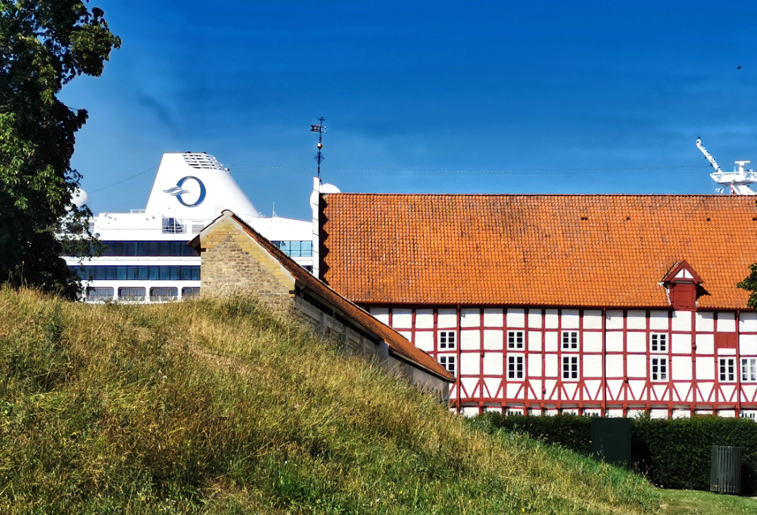 Die Dänen, eine große Seefahrernation. An einem späten Nachmittag rotierte mitten auf dem Fjord in Sichtweite der Promenade ein kleines Ruderboot um die eigene Achse. Drei laut grölende und diskutierende Dänen mit Bierdose schafften es offensichtlich nicht, dem Boot eine konkrete Richtung zu geben. Sie hatten die dänische Nationalflagge gehisst und als einer der Seeleute erschreckenderweise seine Hose auszog, war auch die Unterhose in Nationalfarbe. Historisch gesichert gibt es seit den Wikingern eine lange Tradition, mutig unbekannte Meere zu befahren und fremde Welten zu erobern. Die Drei waren auf dem besten Weg. Wir waren sehr froh über die rote Unterhose. Zwei weitere etwas größere und technisch besser ausgestattete Schiffe lagen am Pier. Das Kreuzfahrschiff Sirena trafen wir ein paar Tage später in Oslo wieder und die Reef Chief, eine 25 Millionen Dollar Yacht des US Amerikaners James Dicke (Vermögen 500 Millionen Dollar). Neugierig sind wir in der Regel nicht, aber die schwarz getönten Scheiben der Yacht, in die alle Touristen schauten, waren blickdicht und auf Deck ließen sich nur 3 hyperaktive Stewards blicken. Wir mussten uns also unsere Informationen aus dem Netz holen. Sehr angenehm für Kreuzfahrtsenioren, dass die Schiffe direkt hinter dem Schloss anlegen und die geführten Gruppen nur die Promenade überqueren müssen.
